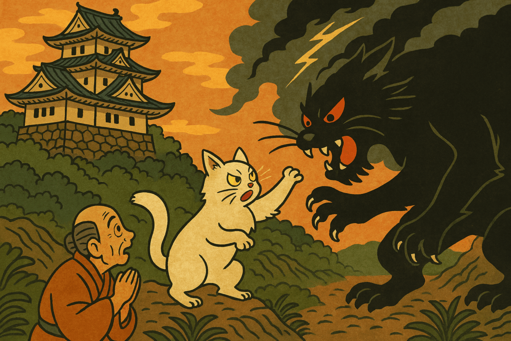 化け物も負けちゃいねぇ。火のような目で白猫をにらみつけ、牙をむいて襲いかかる。